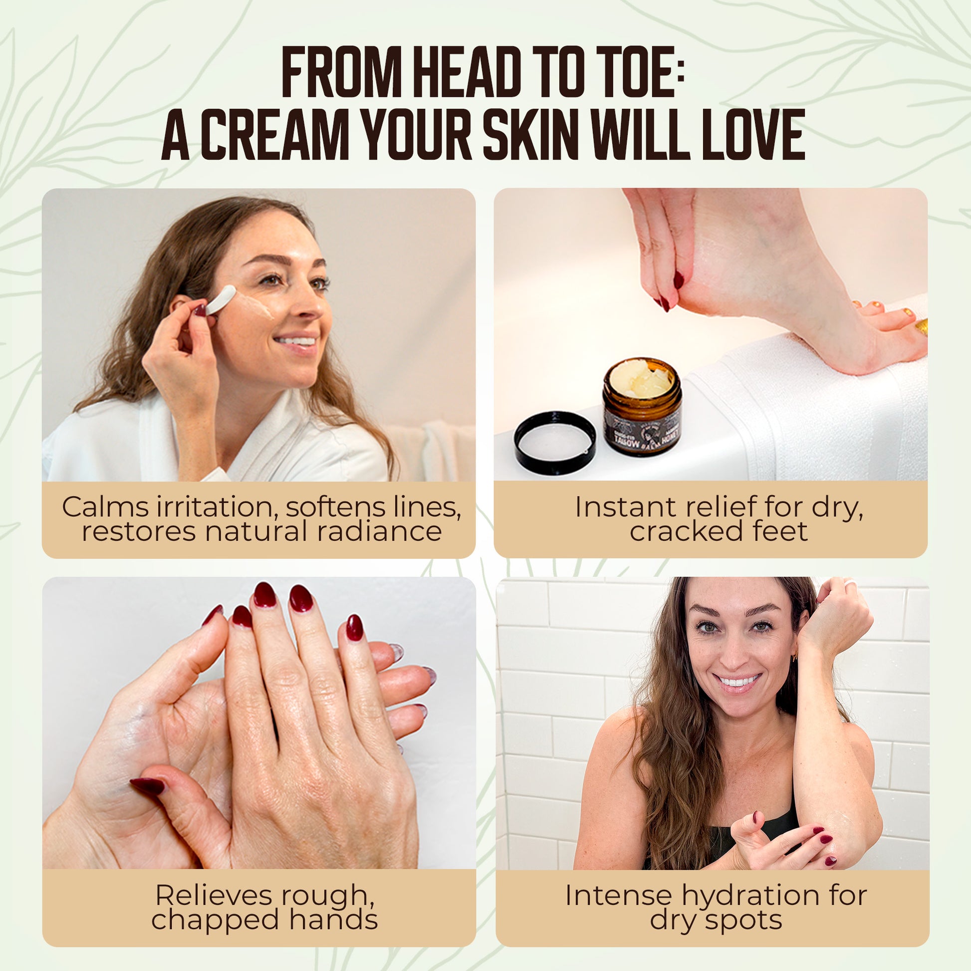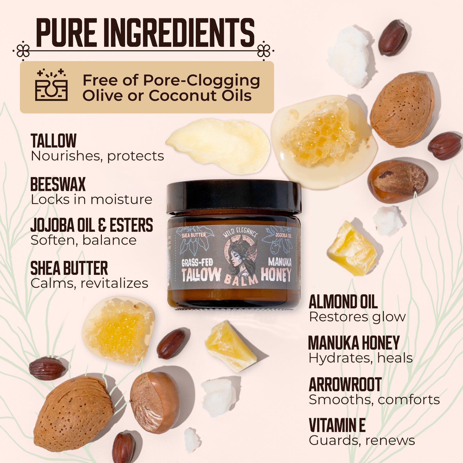 A deeply nourishing, multi-use balm made with grass-fed beef tallow, organic Manuka honey, beeswax, shea butter, jojoba oil, jojoba esters, almond oil, arrowroot, and vitamin E.